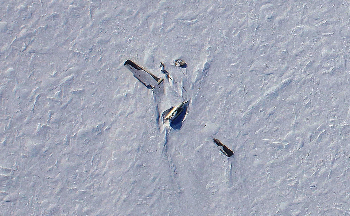 Large target, high latitude, ice-snow covered, airplane wreck, winter conditions, slow decay, geographical stability.