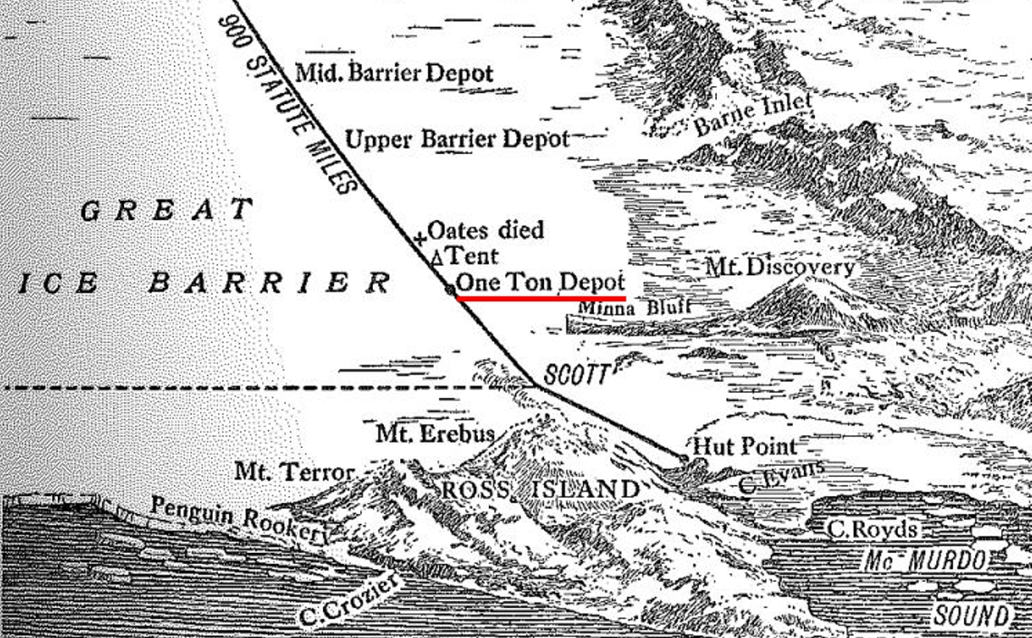 The One Ton Depot was established at latitude 79°29′S, approximately 210 km south of Cape Evans.